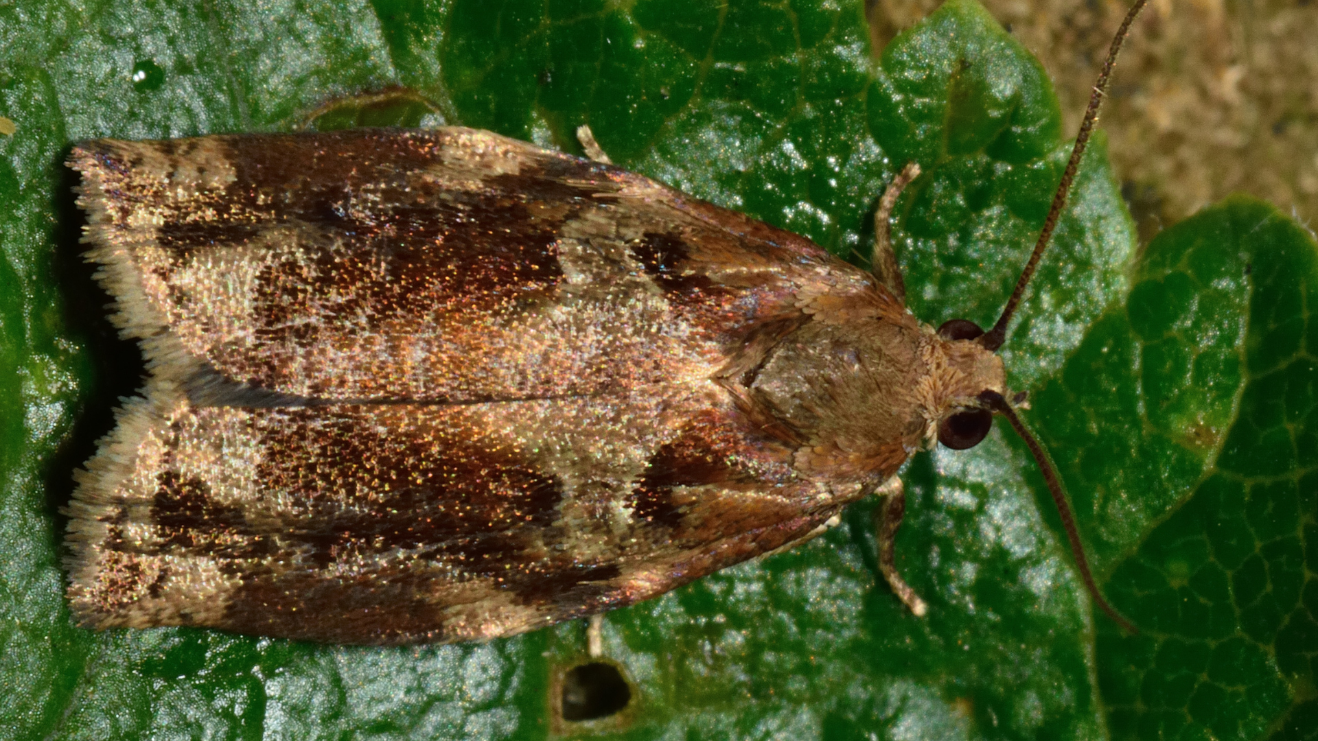Ailes antérieures : Mâle: fond beige à ocre-doré, orné de deux taches basales obliques brun-roux bien délimitées sur la costa et d'une large bande médiane brun foncé n'atteignant pas la côte. Tiers apical tacheté de brun. Le motif est contrasté et caractéristique du genre. Femelle : coloration très différente du mâle brun clair uniforme, densément réticulé de brun sombre, donnant un aspect marbré foncé sans taches individualisées distinctes.